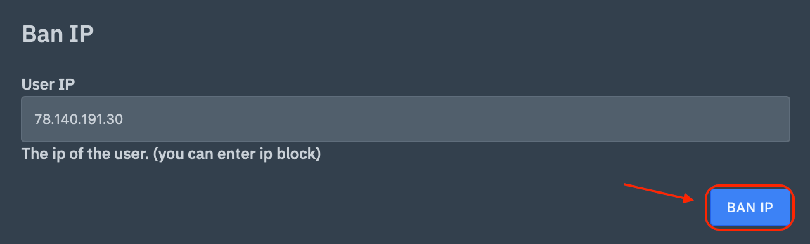 - In the “Ban IP” window, paste the player’s IP in the text field and click the “Ban IP” button.