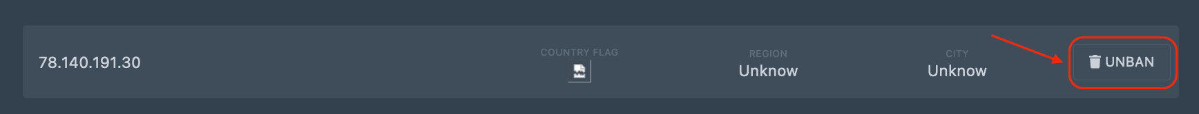 To unban a player, click the «Unban» button next to his name in the ban list.